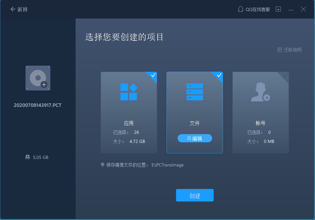 将鼠标停在「创建镜像文件」上,然后单击「创建」。稍后,确认文件名称和默认的储存路径或者也可以自定义储存路径。
