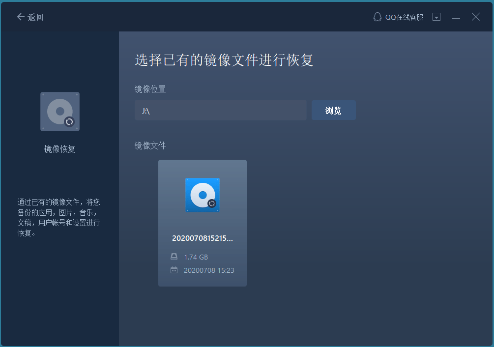 选择显示在界面上的现有镜像文件或指定镜像文件所在的路径,单击「恢复」。