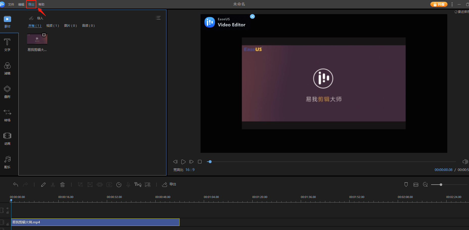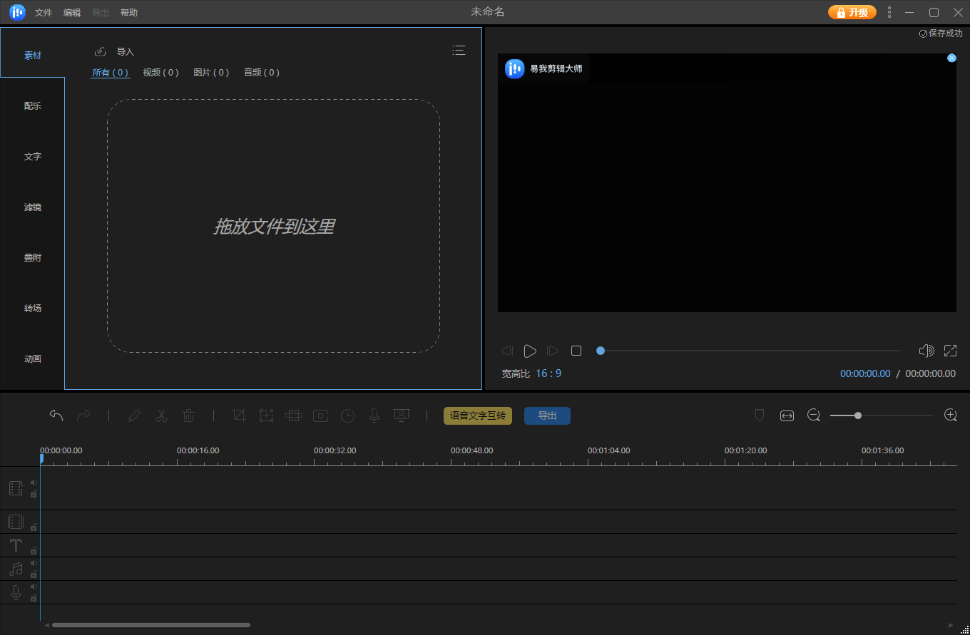 关于视频剪辑,最近朋友推荐了一款不错的,很适合初学者使用的视频剪辑软件,今天,就来分享给大家吧,对了,先介绍一下这款视频剪辑软件的名字,它叫易我剪辑大师。在电脑中打开易我剪辑大师软件,你就可以看到下图中所示的这个画面了,这是一款比较简洁的视频剪辑软件,不过大部分的剪辑功能都有,大家可以看界面的左侧,文字、叠附、转场、动画、滤镜、配乐这些常用的剪辑功能都是有的。