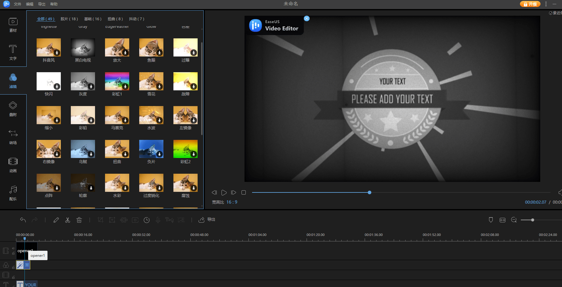 点击添加图片描述(最多60个字)编辑界面上有5个选项卡。请先导入要编辑的影片,将文本/滤镜/垒附/转场应用到影片。如果是第一次安装并执行程序,可以通过逐步提示学习使用基本的功能。