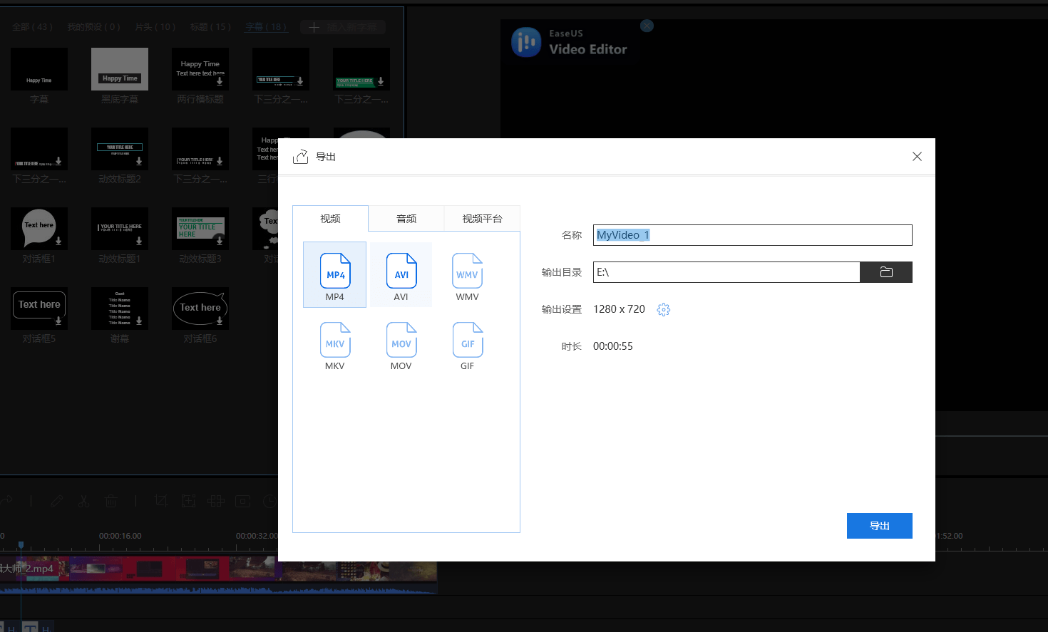 最简单、快速上字幕的方式就是借助影片剪辑工具—易我剪辑大师。工具将字幕永久嵌入影片并可以设定字幕出现的时间、字体、颜色或字形大小。易我剪辑大师提供多达40多种静态和动态字幕样式供选择使用。上完字幕后,直接将影片上传到优酷等。除了添加字幕,易我剪辑大师还有一些很棒的功能等着您体验,包括: